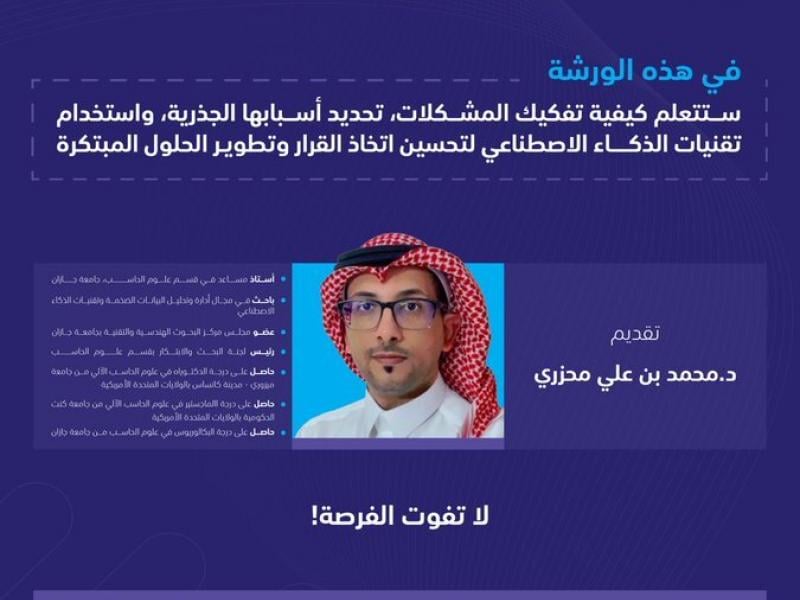 تدعوكم عمادة شؤون الطلاب لحضور ورشة عمل مميزة حول تحليل المشكلات بطرق ذكية واستخدام الذكاء الاصطناعي كأداة فعّالة لإيجاد حلول ريادية مبتكرة.