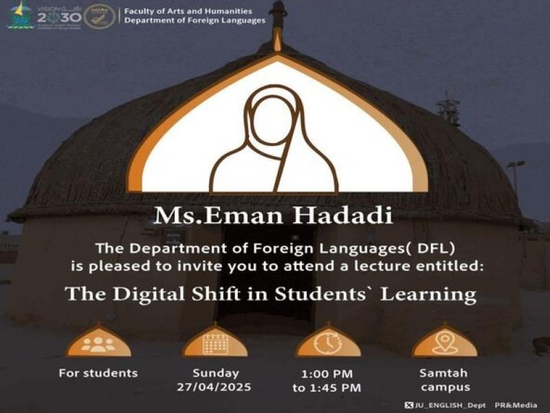 The Department of Foreign Languages (DFL) in collaboration with the PR & Media Committee, organized a workshop for students entitled “The Digital Shift in Students’ Learning.” The workshop was conducted by Ms. Eman Hadadi on Sunday, April 26, 2025 at 1:00 pm on the Samtah Campus.