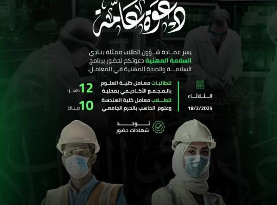 تدعوكم عمادة شؤون الطلاب ممثلة بنادي السلامة المهنية لحضور برنامج السلامة والصحة المهنية في المعامل