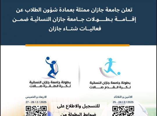 شارك منتخب طالبات جامعة جازان لكرة الريشة الطائرة في بطولة الاتحاد السعودي للرياضة الجامعية، التي نظمتها جامعة عفت بمدينة جدة. وتهدف هذه المشاركة إلى نشر الوعي بأهمية رياضة الريشة الطائرة بين الطالبات، وتعزيز تمكينها في الأوساط الجامعية