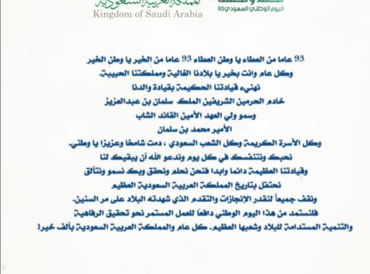 تسعة عقود من العز والفخر في #اليوم_الوطني_السعودي_93 يرفع *فضيلة عميد الكلية، د. علي صميلي*، التهنئة إلى مقام خادم الحرمين الشريفين، وسمو ولي عهده الأمين، حفظهما الله.