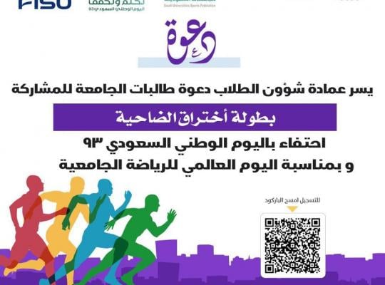 يسر عمادة شؤون الطلاب دعوة طالبات الجامعة للمشاركة في بطولة اختراق الضاحية احتفاء باليوم الوطني السعودي 93 وبمناسبة اليوم العالمي للرياضة الجامعية الموعد : الاثنين 17/03/1445 هـ الرابعة مساءَ مكان الانطلاق : مجمع الطالبات بمحلية