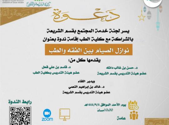 برعاية كريمة من سعادة عميد كلية الشريعة والقانون د.علي بن طاهر صميلي أقام قسم الشريعة بكلية الشريعة والقانون ممثلا في لجنة خدمة المجتمع بكلية الشريعة والقانون يوم الأحد 4/9/1444هـ ندوة بعنوان "نوازل الصيام بين الفقه والطب" بالتعاون مع كلية الطب وقد
