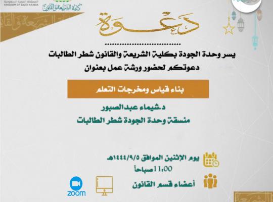 نفذت وحدة الجودة بكلية الشريعة والقانون شطر الطالبات ورشة عمل بعنوان (بناء قياس ومخرجات التعلم) استهدفت عضوات هيئة التدريس ببرنامج القانون حيث تناولت فيها مفهوم مخرجات التعلم وتحديد العوامل المرتبطة بصياغة وبناء مخرجات التعلم والربط بين مخرجات التعلم