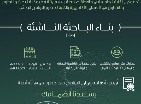 اختتمت وكالة البحث والتطوير في الكلية الجامعية بمحافظة صامطة (سابقاً) ممثلة في وحدة البحث العلمي بالتعاون مع الأقسام الأكاديمية بالكلية البرنامج البحثي "بناء الباحثة الناشئة" في دورته الثالثة. استهدف البرنامج الطالبات المسجلات في مقرر مشروع التخرج في