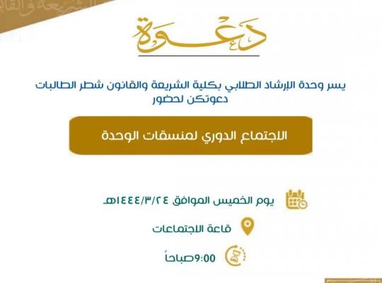 نفذت منسقة وحدة الإرشاد الطلابي المحاضرة تهاني فلقي عضو هيئة التدريس بكلية الشريعة والقانون شطر الطالبات الاجتماع الدوري الأول مع منسقات الوحدة لجميع الأقسام بالكلية تضمنت المحاور التالية مناقشة الخطة التنفيذية الارشادية وتوزيع الدورات والأنشطة على