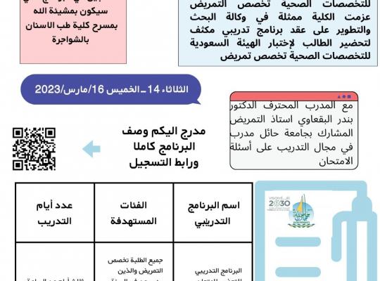البرنامج التدريبي للتحضير لامتحان SNLE يسرنا دعوتكم لحضور البرنامج التدريبي وذلك لتحضير طلاب وطالبات الامتياز لاختبار الهيئة السعودية للتخصصات الصحية والذي سيقدمه الدكتور بندر البقعاوي في الفترة من ١٤ - ١٦ - مارس ٢٠٢٣