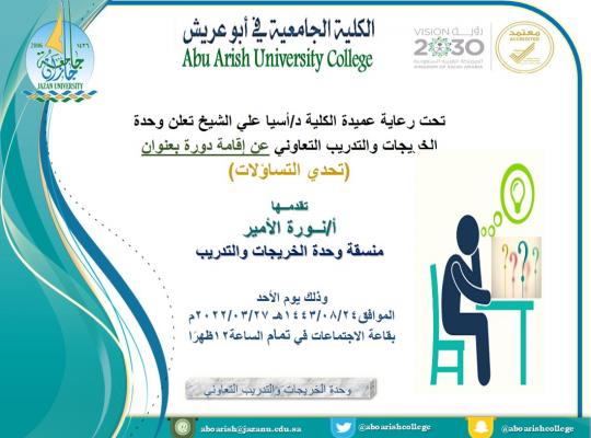 نظمت منسقة وحدة الخريجات والتدريب التعاوني أ. نورة علي الأمير فعالية بعنوان (تحدي التساؤلات)، وكانت الفعالية بحضور عميدة الكلية د.آسيا علي الشيخ ووكيلة الكلية للشؤون الأكاديمية أ/ هناء دغريري وبتنفيذ منسقة الوحدة استهدفت جميع طالبات الكلية المتوقع
