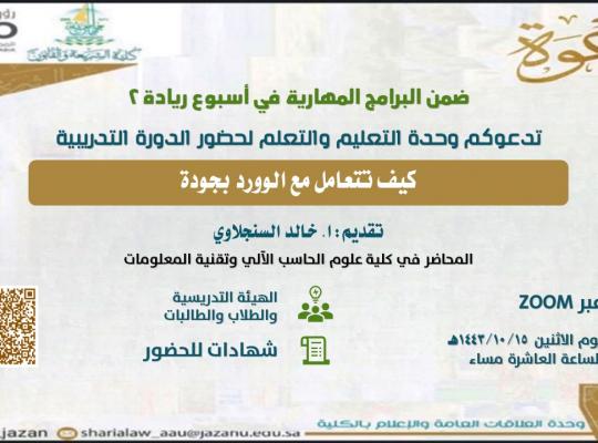 ضمن فعاليات ريادة٢ 🎙 دورة " قاعتك علم ومهارة " 👤يقدمها د. صقر بن أحمد طوهري (رئيس قسم الشريعة) 🗓 الاثنين ١٥ شوال ١٤٤٣هـ 🕰 الساعة ٨.٣٠ مساء https://zoom.us/j/91637501258?pwd=S0oxL0RTZDkxdWVURlN2aXEvd0xPdz09 📌 الهيئة التدريسية، والطلاب والطالبات 📜 توجد