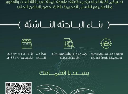 نظمت وكالة البحث والتطوير في الكلية الجامعية بمحافظة صامطة بالتعاون مع الأقسام الأكاديمية بالكلية برنامجاً بحثياً بعنوان (بناء الباحثة الناشئة). استهدف البرنامج الطالبات المسجلات في مقرر مشروع التخرج في الأقسام المختلفة وأيضاً جميع المهتمات بالبحث