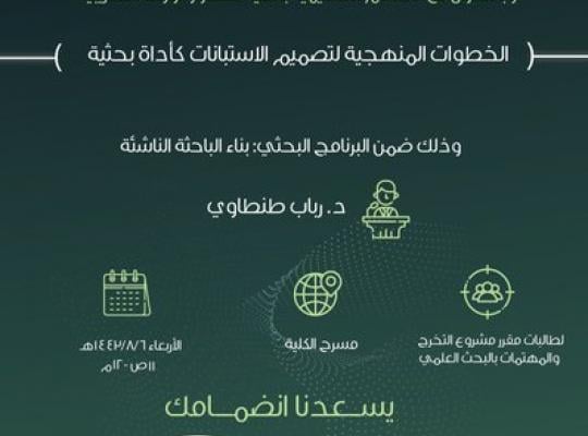 نفذت الكلية الجامعية بصامطة ممثلة في وكالة البحث والتطوير بالتعاون مع الأقسام الأكاديمية الجامعية بالجامعة ورشة تدريبية بعنوان "الخطوات المنهجية لتعميم الاستبيان كأداة بحثية" وذلك ضمن البرنامج البحثي بناء الباحثة الناشئة نفذتها د. رباب طنطاوي مستهدفة