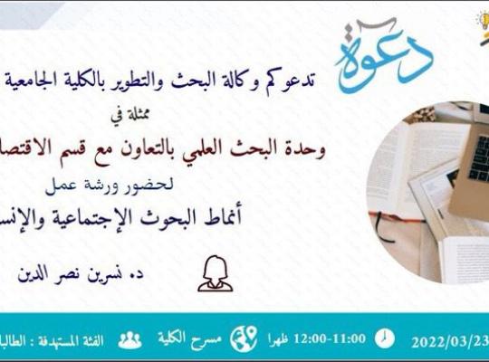 نفذت وحدة البحث العلمي بالكلية الجامعية بمحافظة صامطة بالتعاون مع قسم الاقتصاد المنزلي ورشة عمل بعنوان "أنماط البحوث الاجتماعية والإنسانية". قدمتها الدكتورة نسرين نصر الله، واستهدفت فيها طالبات الكلية. تمثلت محاور الورشة في طرق تحصيل المعرفة ومنها