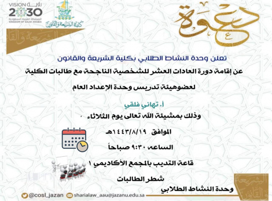 💎 برعاية كريمة من فضيلة عميد كلية الشريعة والقانون أ.د.محمد بن ناصر جده ✨ تنظم وكالة كلية الشريعة والقانون للتطوير -ممثلة في وحدة التعليم والتعلم-: 🪑💡 *مجالس الخبرات التعليمية-الطالب* 🕶️ يقدمه: 🎙️ محمد علي طوهري الطالب في المستوى الثامن- قسم الشريعة