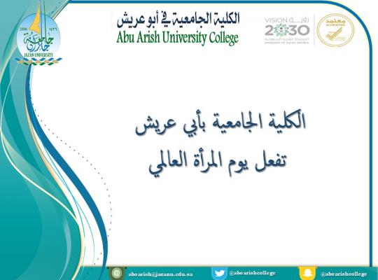 برعاية عميدة الكلية بأبي عريش د. آسيا علي الشيخ فعلت الكلية اليوم العالمي للمرأة بلقاء جمع طالبات ومنسوبات الكلية نفذته د. سلوى آدم يوم الأحد الموافق 27-3-2022م وكان من أبر المحاور : مفهوم اليوم العالمي تاريخ اليوم العالمي حكم وامثال عن المرأة قصائد