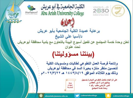 تزامنًا مع أسبوع البيئة قامت وحدة خدمة المجتمع بالكلية الجامعية بأبي عريش بتوجيهات عميدة الكلية الدكتورة آسيا علي حيدر الشيخ بالتعاون مع بلدية محافظة أبو عريش بتفعيل مبادرة تحت شعار (بيئتنا مسؤوليتنا) من خلال تعاون طالبات ومنسوبات الكلية مع عمال