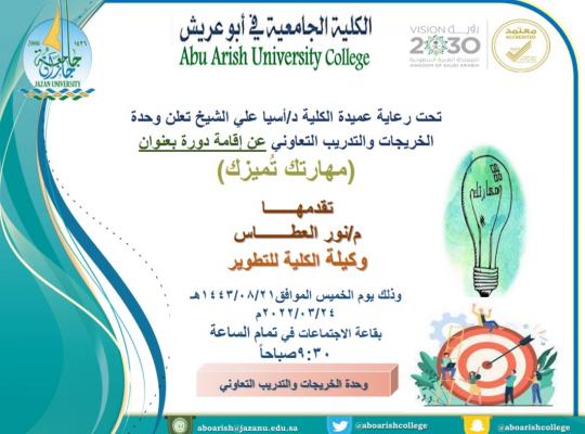 نظمت منسقة وحدة الخريجات والتدريب التعاوني أ/ نورة علي الأمير فعالية بعنوان مهارتك تميزك وكانت الفعالية بحضور عميدة الكلية د/ اسيا علي الشيخ ووكيلة الكلية للشؤون الأكاديمية م.هناء دغريري وبتنفيذ م. نور العطاس استهدفت جميع طالبات الكلية المتوقع تخرجهن