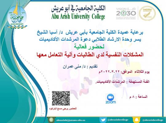 برعاية عميدة الكلية د. آسيا على حيدر الشيخ نظمت منسقة وحدة الإرشاد الطلابي بالكلية د. نهاد سراج فعالية بعنوان (المشكلات النفسية لدى الطالبات وآلية التعامل معها) وكانت الفعالية بتنفيذ د. منى عمران استهدفت جميع المرشدات وذلك يوم الثلاثاء الموافق 19-8