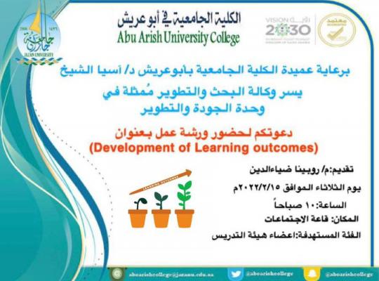 نظمت وحدة الجودة والتطوير بالكلية الجامعية بأبو عريش ورشة عمل بعنوان "تطوير نتائج التعلم" لأعضاء هيئة التدريس. أقيمت ورشة العمل يوم الثلاثاء الموافق 15/2/2022م من الساعة 10صباحًا حتى 12 ظهرًا في قاعة الاجتماعات بالكلية الأهداف: • تحديد نقاط القوة