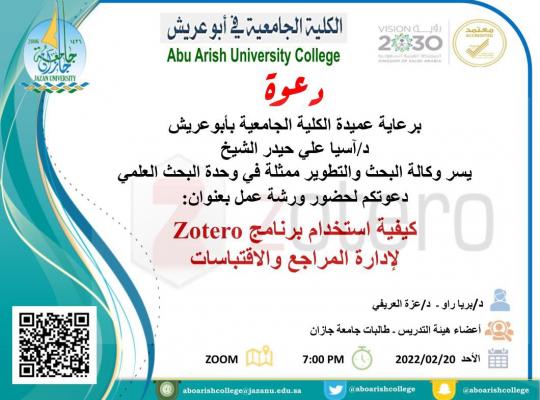 نظمت وحدة البحث العلمي بالكلية الجامعية بأبوعريش ورشة عمل بعنوان (كيفية استخدام برنامج Zotero لإدارة المراجع والاقتباسات) يوم الاحد الموافق 20/2/22م الساعة 7 مساء عبر منصة ZOOM وتضمنت الورشة على عدة محاور وهي كالاتي: تحدثت عن رسالة ورؤية جامعة جازان