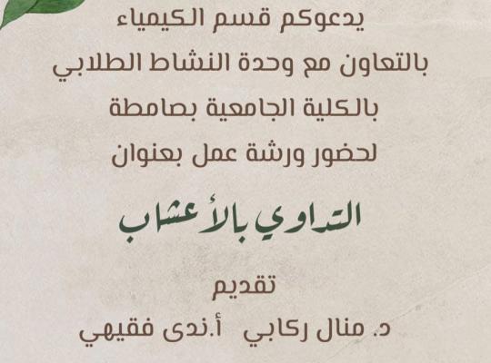 نظم قسم الكيمياء بالتعاون مع وحدة النشاط الطلابي بالكلية الجامعية بصامطة ورشة عمل بعنوان "التداوي بالأعشاب". نفذتها د.منال ركابي و أ.ندى فقيهي، واستهدفت طالبات قسم الكيمياء. في بداية الورشة تم استفتاء الحاضرات حول تأييدهم للعلاج بالاعشاب لمعرفة