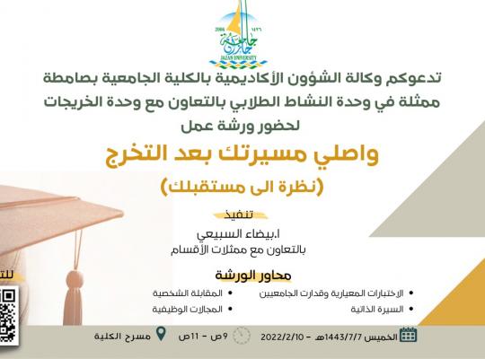 نظمت الكلية الجامعيةبصامطة ممثلةً في وحدة النشاط الطلابي وبالتعاون مع وحدة الخريجات ورشة عمل بعنوان (واصلي مسيرتك بعد التخرج "نظرة إلى مستقبلك"). نفذتها الأستاذة/بيضاء السبيعي، وشارك فيها عدد من ممثلات الأقسام ، أستهدفت فيها الخريجات والطالبات