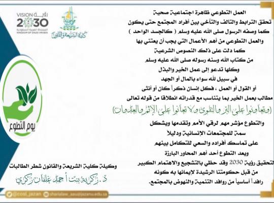 العمل التطوعي ظاهرة اجتماعية صحية تحقق الترابط والتاَلف والتآخي بين أفراد المجتمع حتى يكون كما وصفه الرسول صلى الله عليه وسلم ( كالجسد الواحد ) والعمل التطوعي من أهم الأعمال التي يجب أن يعتني بها كما دلت على ذلك النصوص الشرعية من كتاب الله وسنه رسوله