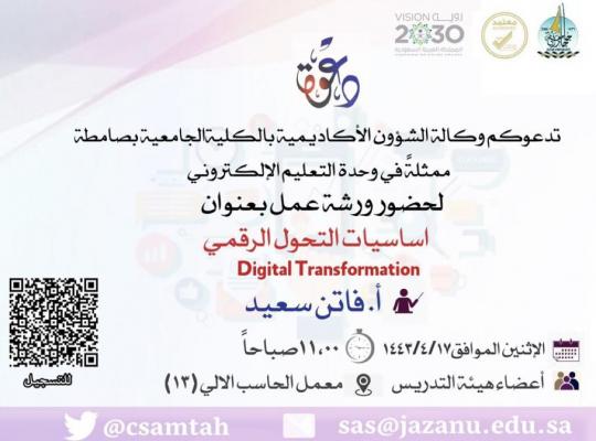 نفذت الكلية الجامعية بصامطة ممثلةً في وحدة التعليم الإلكتروني ورشة عمل بعنوان "أساسيات التحول الرقمي". نفذتها أ.فاتن سعيد واستهدفت فيها أعضاء هيئة التدريس. والتحول الرقمي له دوره في تطور الحياة الإنسانية والتغيير الإجتماعي لحياة الأفراد وغرس كثير من