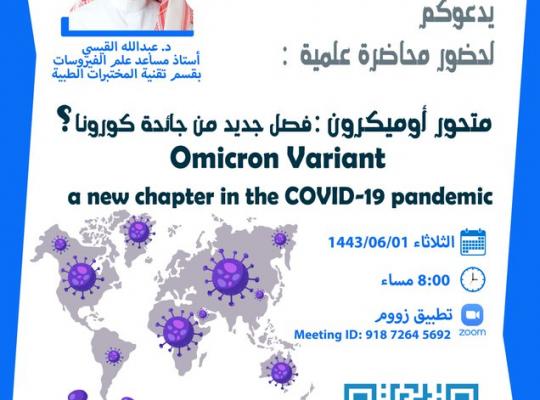 يدعوكم قسم تقنية المختبرات الطبية بالتعاون مع مركز الأبحاث الطبية لحضور محاضرة علمية بعنوان : متحور أوميكرون: فصل جديد من جائحة كورونا ؟ Omicron Variant: a new chapter in the COVID-19 pandemic الثلاثاء ١٤٤٣/٦/١ ٨:٠٠ مساءاً تطبيق زووم دخول القاعة من
