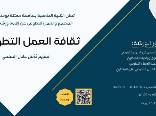 نفذت الكلية الجامعية بصامطة ممثلة في وحدة خدمة المجتمع والتعليم المستمر ورشة عمل بعنوان "ثقافة العمل التطوعي". قدمتها أ. أمل السلمي، وقد تطرقت الورشة لدور التطوع في تنمية المجتمعات، إضافة إلى أهمية العمل التطوعي لدى الأفراد والمكتسبات الإيجابية