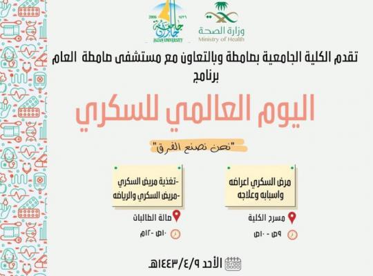 تزامناً مع اليوم العالمي للسكري، نظمت الكلية الجامعة بصامطة و بالتعاون مع مستشفى صامطة العام برنامجاً توعوياً عن مرض السكري تحت عنوان "نحن نصنع الفرق" بإشراف وحدة النشاط الطلابي. بدأ البرنامج بمحاضرة توعوية تثقيفية بعنوان (السكاكر والسكري) نفذتها
