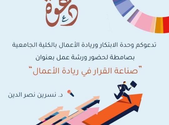 نظمت وحدة الابتكار وريادة الأعمال بالكلية الجامعية بصامطة ورشة عمل بعنوان "صناعة القرار في ريادة الأعمال". نفذتها د. نسرين نصر الدين، والتي استهدفت طالبات الكلية. هدفت الورشة إلى إكساب الطالبات المفاهيم والمهارات الخاصة باتخاذ القرار في المؤسسات