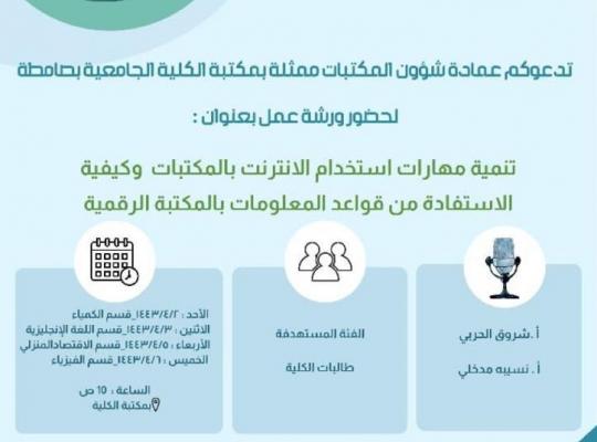 نظمت عمادة شؤون المكتبات ممثلة بمكتبة الكلية الجامعية بصامطة ورشة عمل بعنوان "تنمية مهارات استخدام الانترنت بالمكتبات وكيفية الاستفادة من قواعد المعلومات بالمكتبة الرقمية السعودية". و تعتبر المكتبة الرقمية السعودية مساندةً لمنظومة التعليم الجامعي