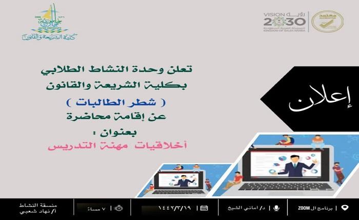 نظمت وحدة النشاط الطلابي بكلية الشريعة والقانون فعالية بعنوان أخلاقيات مهنة التدريس والبحث العلمي للأعضاء بالكلية قامت بتنفيذها الدكتورة أماني عبد المتعال الشيخ عبدالله عبر منصة الزوم بحضور عدد من أعضاء هيئة الترديس.