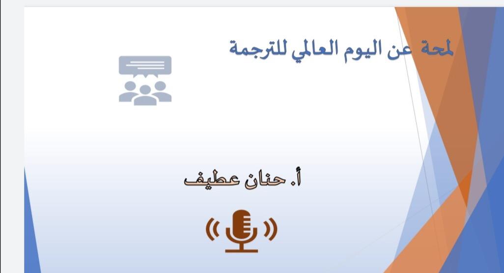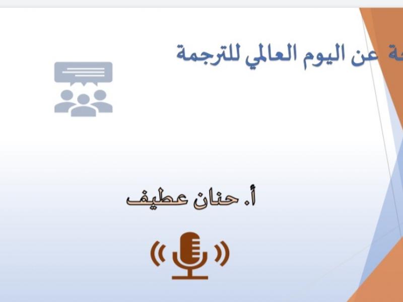 البرنامج انطلق بلمحة عن اليوم العالمي للترجمة ألقتها أ. حنان عطيف حيث أطلق الاتحاد الدولي فكرة الاحتفاء باليوم العالمي للترجمة كيوم معترف به رسميا، وذلك لإظهار تعاضد المترجمين في جميع أنحاء العالم ولتعزيز مهنة الترجمة في مختلف الدول وتعتبر الاحتفالية فرصة لعرض مزايا هذه المهنة التي تزداد أهمية يوما عن الآخر في عصر العولمة.