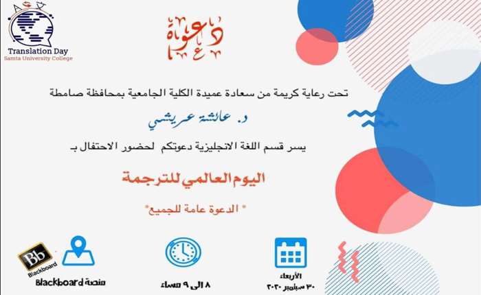 نظمت الكلية الجامعية بصامطة ممثلةً في قسم اللغة الإنجليزية احتفالاً باليوم العالمي للترجمة والذي رعته عميدة الكلية د. عائشة عريشي عبر نظام البلاك بورد.