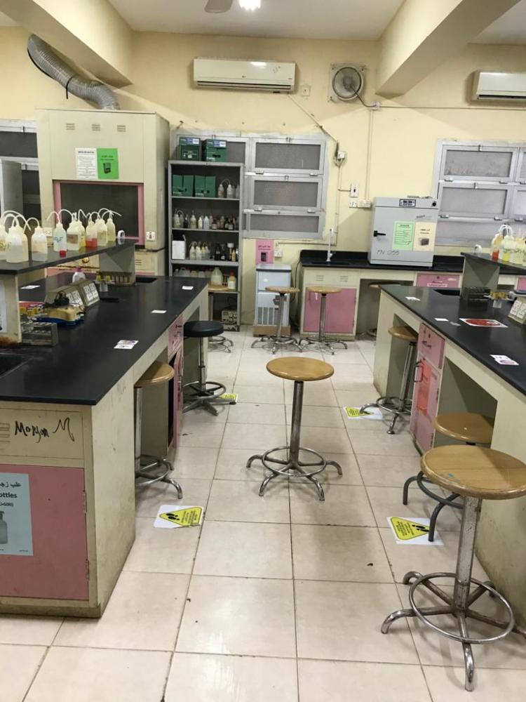 وقد جهزت الكلية جميع المعامل بكافة الاحترازات الوقائية بإشراف محضرات المختبر للأقسام العلمية حيث أكدت عميدة الكلية د. عائشة عريشي على الاستعداد والجاهزية والالتزام بالإجراءات الاحترازية بوضع ضوابط وآليات تسهم في سلامة منسوبي الكلية من الإصابة بكوفيد 19 وضمن الاجراءات خفض الطاقة الاستيعابية داخل المعامل بنسبة 50٪من المجموع الكلي للمتواجدات حرصاً على سلامة الجميع.