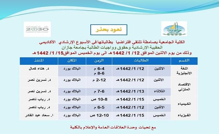 كما تم تعريفهن بجميع وحدات الكلية ومرافقها والخدمات التي تقدمها الكلية للطالبات وتعريفهن بالقواعد التنفيذية ولائحة الدراسة والاختبارات بجامعة جازان وكيفية الدخول إلى المكتبة الرقمية واستخدام البوابة الإلكترونية لجامعة جازان وأهم الحركات الأكاديمية، وتوعية الطالبات بحقوقهن وواجباتهن أثناء سيرهن في العملية التعليمية من خلال عرض لائحة حقوق وواجبات الطلاب بجامعة جازان وتعريف الطالبات بالطرق المختلفة للتواصل مع المرشدات.