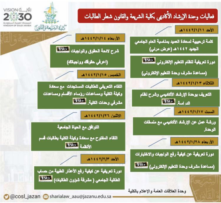 قدمت وحدة الإرشاد الأكاديمي بكلية الشريعة والقانون شطر الطالبات برامج إرشادية افتراضية تحت إشراف وكيلة كلية الشريعة والقانون شطر الطالبات د/ زكرية أحمد غلفان زكري.