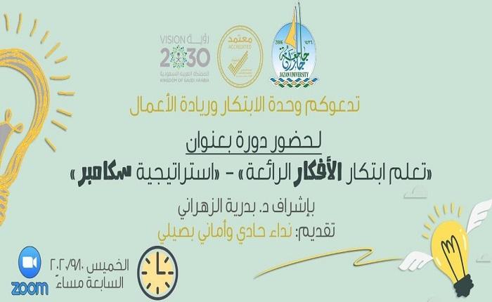 نظمت الكلية الجامعية بصبيا ممثلةً بوحدة الابتكار وريادة الأعمال دورة تدريبية بعنوان ” تعلم ابتكار الأفكار الرائعة واستراتيجية سكامبر ” قدمتها كلاً من: أ. نداء حادي و أ. أماني بصيلي عبر تطبيق الزوم وذلك بهدف التعرف على استراتيجية سكامبر وكيفية تطبيقها في مختلف المجالات الحياتية.