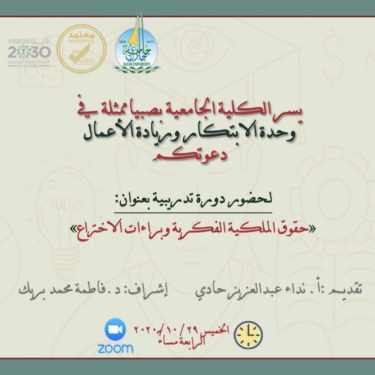 بحضور وكيل الجامعة للابتكار وريادة الأعمال د. نايف أزيبي نفذت الكلية الجامعية بصبيا مُمثلةً في وحدة الابتكار وريادة الأعمال دورة تحت عنوان الملكية الفكرية وبراءات الاختراع قدمتها أ. نداء حادي.