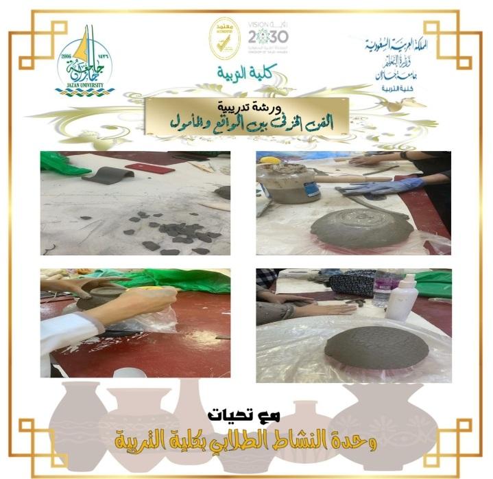 أقامت كلية التربية ممثلة في وحدة النشاط الطلابي بالتعاون مع وحدة العلاقات العامة دورة تدريبية بعنوان (الخزف الفني بين الواقع والمأمول) للمقرر العملي، نفذتها الأستاذة / فاطمة الحازمي حضرها (١٥) طالبة وعدد من الإدارات بالكلية مع مراعاة كافة الإجراءات الاحترازية والإرشادات الوقائية.