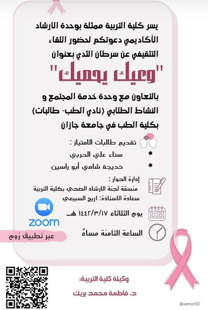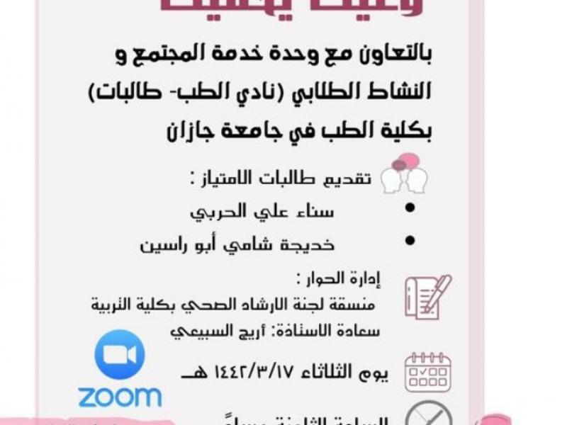 أقامت كلية التربية بصبيا ممثلة بوحدة النشاط الطلابي ووحدة الإرشاد الأكاديمي بالتعاون مع خدمة المجتمع بكلية الطب لقاءً بعنوان (وعيك يحميك ) حضرها عدد من الطالبات والإداريات وعدد من أعضاء هيئة التدريس.