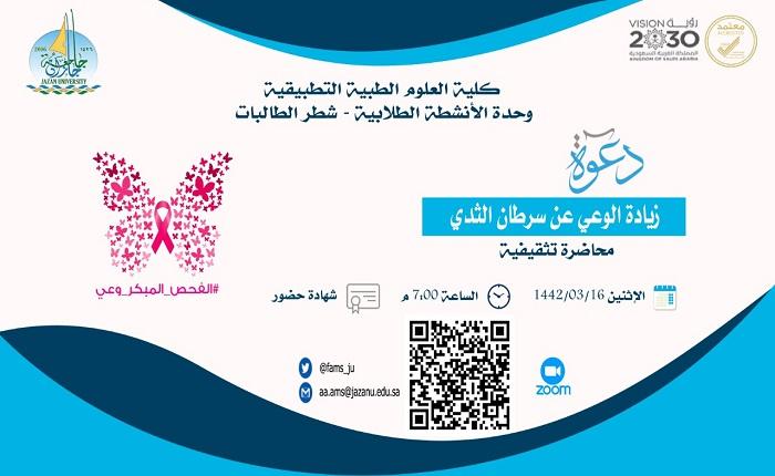 نظمت وحدة الانشطة الطلابية بكلية العلوم الطبية التطبيقية محاضرة بعنوان ((زيادة الوعي بسرطان الثدي)) والتي تأتي ضمن خطة الوحدة المعتمدة قدمتها المحاضرة عزة القرني بحضور 75 طالبة.