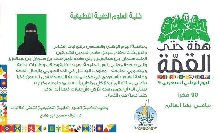 نظمت كلية العلوم الطبية التطبيقية بمناسبة اليوم الوطني السعودي عدد من البرامج والفعاليات تمثلت في لقاءات حوارية قصيرة مع طالباتها تحت شعار ((٩٠ فخراً نباهي بها العالم ))