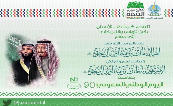 في ذكرى اليوم الوطني السعودي التسعون احتفت كلية طب الأسنان عبر منصة زوم بهذه المناسبة وسط حضور كثيف من أعضاء هيئة التدريس ووكلاء الكلية وطلابها وطالبتها بمختلف مراحلهم وذلك بإقامة عددٍ من الفعاليات والبرامج التي نظمتها وحدة العلاقات العامة بالكلية بالتعاون مع وحدة النشاط الطلابي ونادي ابتسامة، حيث تحرص سنوياً على الاحتفال بهذا اليوم لتعميق روح المواطنة لدى أبنائها وبناتها بمشاركتهم في المناسبات الوطنية، وتنظيمهم لها.