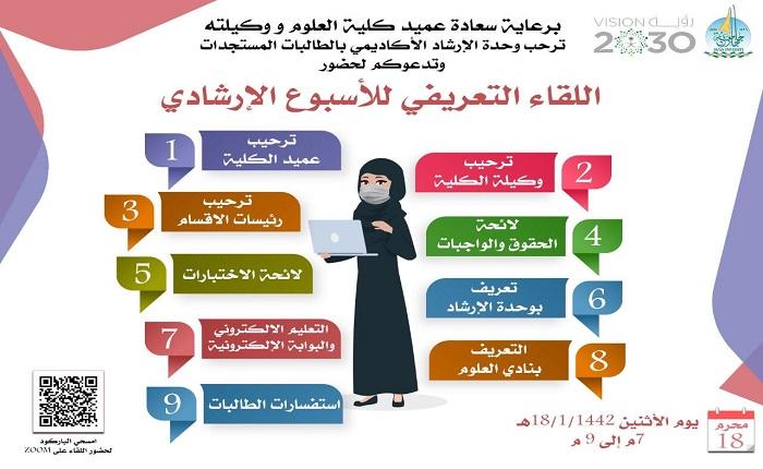 نظمت كلية العلوم – شطر الطالبات اللقاء التعريفي الإرشادي برعاية وكيلة الكلية د. آمنه شماخي والذي نفذ عبر برنامج الزووم حيث تم من خلاله استضافة 100 طالبة مستجدة في كافة التخصصات العلمية.