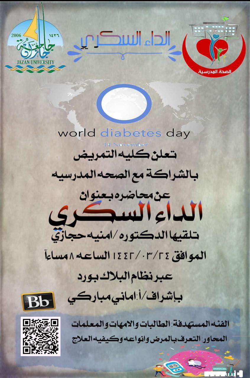 نفذت كلية التمريض بالتعاون مع الصحة المدرسية بإدارة تعليم جازان برنامجا ومحاضرة توعوية عن اليوم العالمي لداء السكري لمنسوباتها من أعضاء هيئة التدريس والطالبات والإداريات (عن بعد) من تقديم الدكتورة أمنية حجازي بإشراف الأستاذة أماني مباركي رئيسة وحدة النشاط والنادي الطلابي.