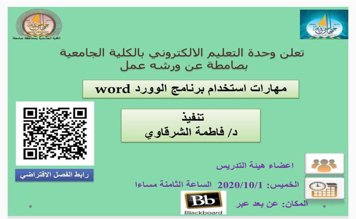 نظمت وحدة التعليم الإلكتروني في الكلية الجامعية بصامطة ورشة عمل بعنوان مهارات استخدام الوورد من إعداد وتنفيذ د. فاطمة الشرقاوي استهدفت أعضاء هيئة التدريس من خلال نظام البلاك بورد.