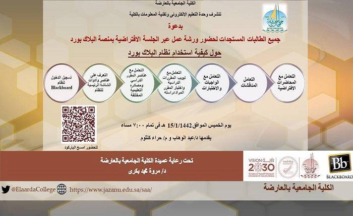 نظمت وحدة التعليم الإلكتروني وتقنية المعلومات في الكلية الجامعية بالعارضة ورشة عمل للطالبات المستجدات بعنوان “أساسيات استخدام البلاك بورد في التعليم الإلكتروني ” قدمتها منسقة الوحدة المحاضر هيرا كالسيوم عبر الجلسة الافتراضية لمنصة البلاك بورد.
