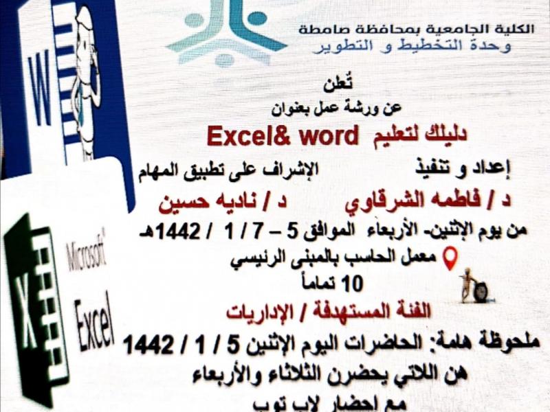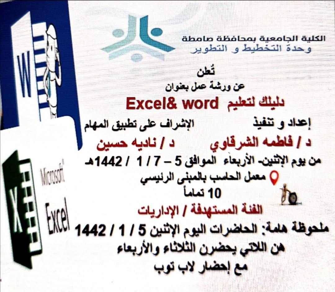 نظمت الكلية الجامعية بصامطة ممثلةً في وحدة التخطيط والتطوير ورشة عمل بعنوان دليلك لتعليم word&Excel من تنفيذ الدكتورة فاطمة الشرقاوي وإشراف على تطبيق المهام الدكتورة نادية حسين وكانت الفئة المستهدفة الإداريات تطرقت لعدة محاور من أهمها التعريف بالورد وتوضيح أهم مميزاته وبينت كيفية استخدام نماذج الوورد المختلفة وتقنياته ثم أوضحت تنسيقات المستند وإدراج الارتباطات التشعبية والاختصارات داخل المستند ثم بينت لهن آلية الحفظ بطرق مختلفة مما يسهل البحث عنه أثناء الحاجه إلية ومن ثم تم التطبيق على ما قد تناولته في بداية الورشة.